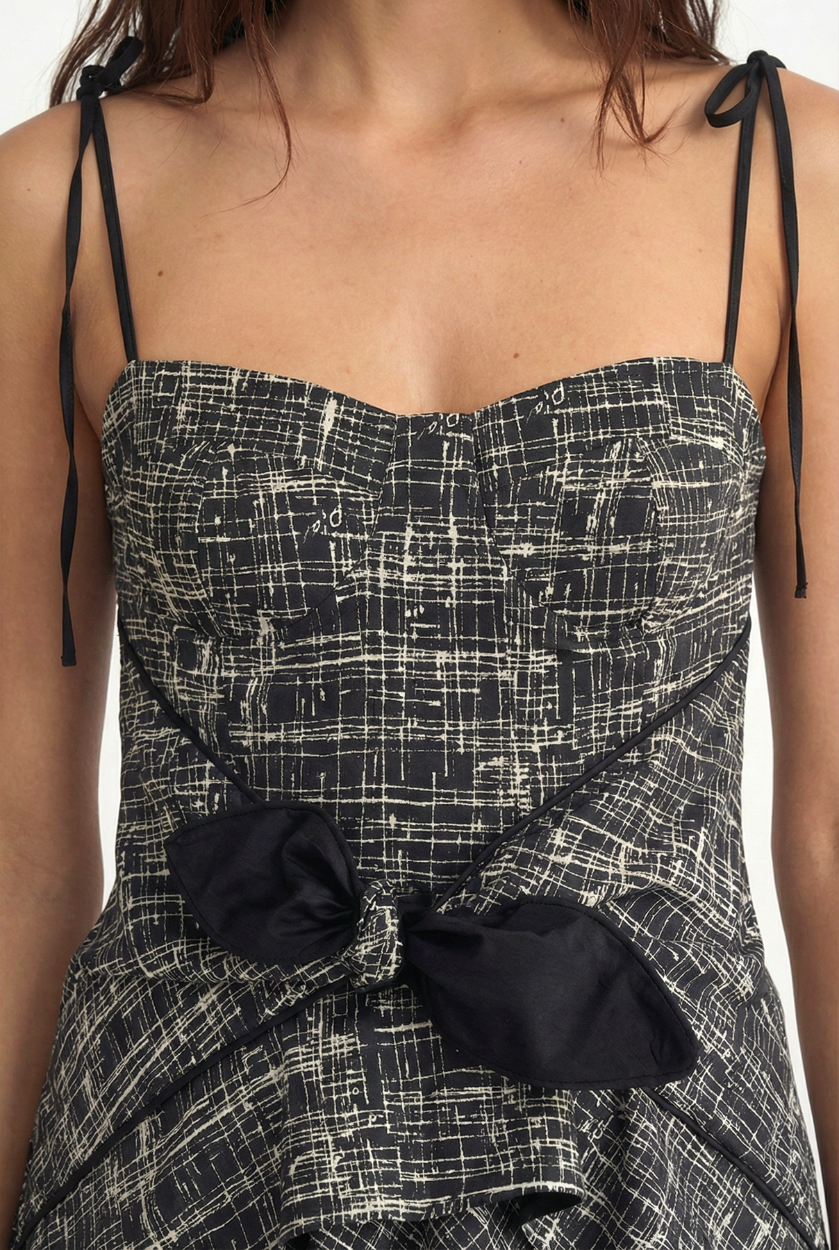 This long dress combines black crossed-line fabric with a asymmetric design for a unique and modern look. Featuring a front tie detail and matching fabric used for the straps and tie, the dress showcases a striking, cohesive design. The fitted bodice with cup detailing enhances the shape, while the asymmetrical hemline adds a contemporary twist to the overall silhouette.