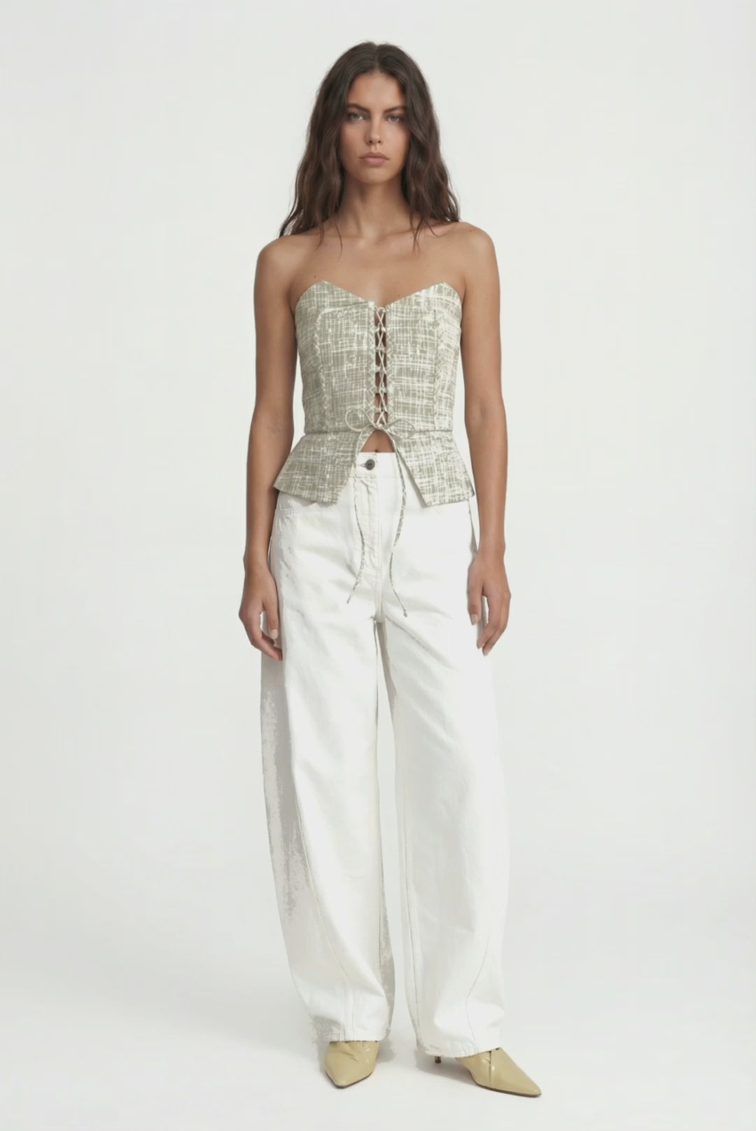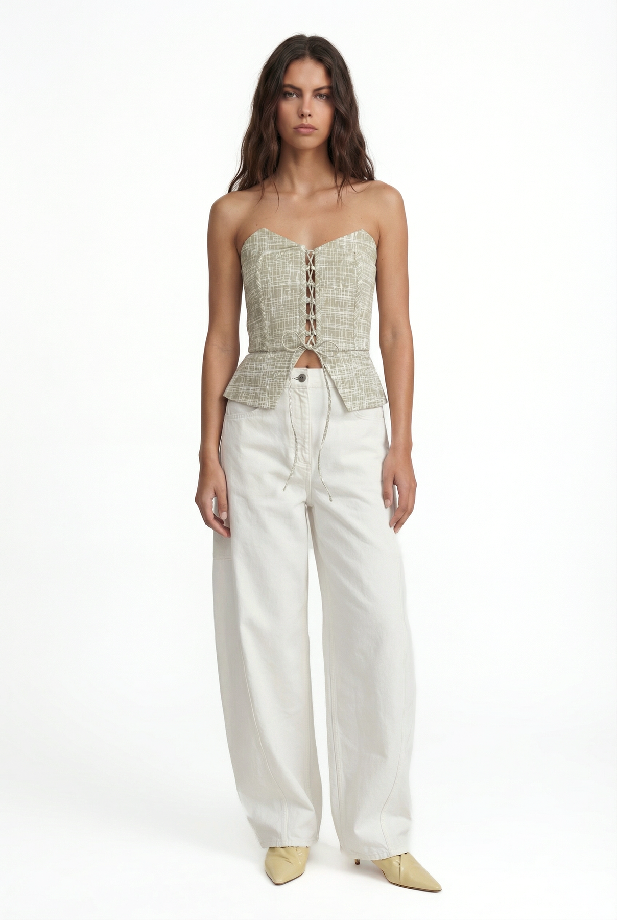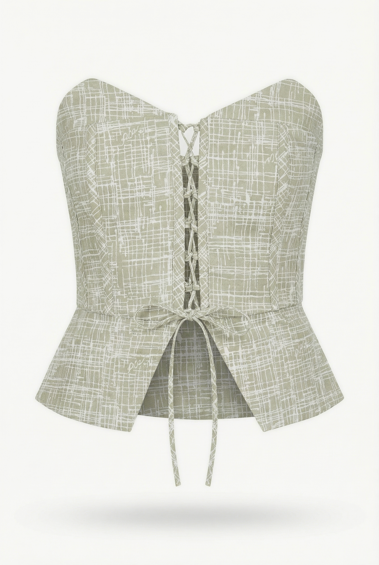 Haki tonunda, çapraz çizgi baskılı Bianco büstiyer; yanlardaki grogren balen detaylarıyla daha yapısal bir siluet sunar. Yan kısmında gizli fermuar bulunur. Ön kısmındaki ayarlanabilir büzgü ipi sayesinde kişiye göre uyum sağlar.