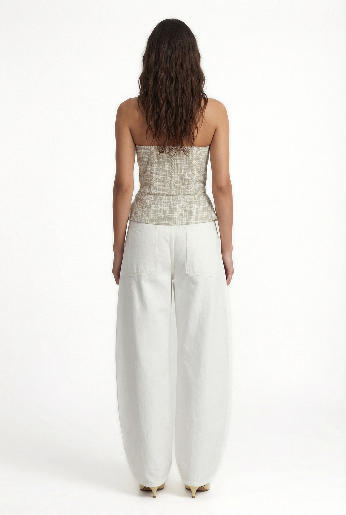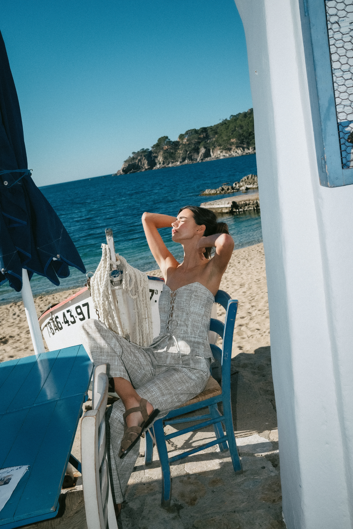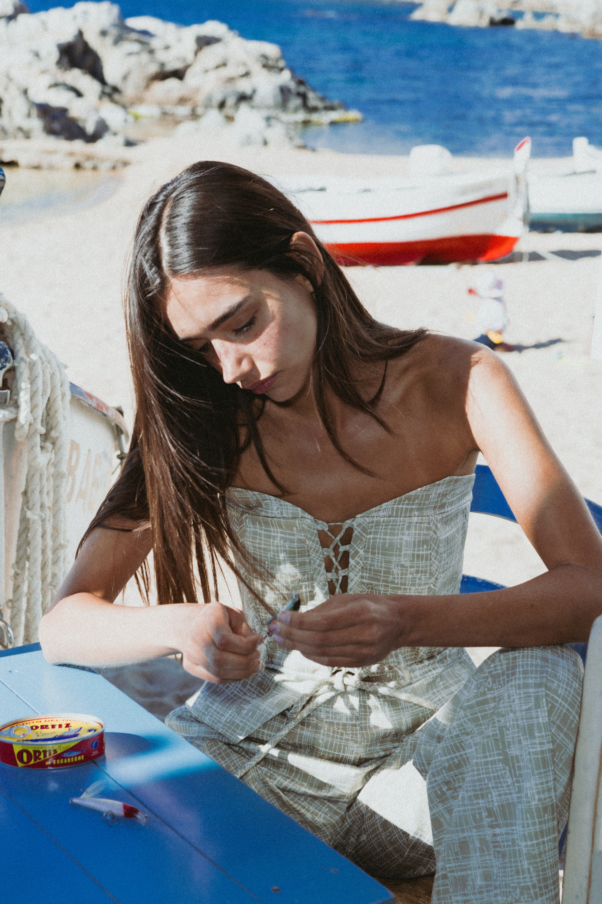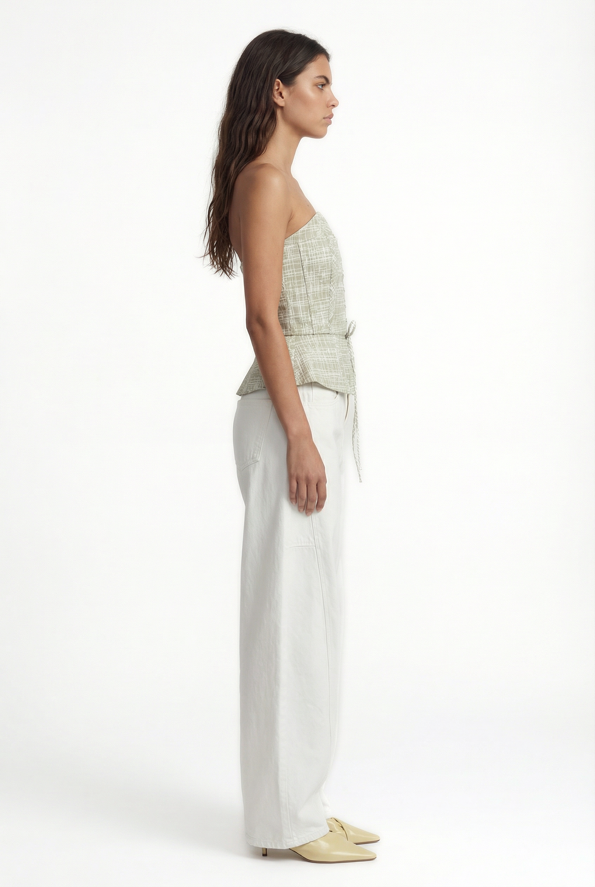 Haki tonunda, çapraz çizgi baskılı Bianco büstiyer; yanlardaki grogren balen detaylarıyla daha yapısal bir siluet sunar. Yan kısmında gizli fermuar bulunur. Ön kısmındaki ayarlanabilir büzgü ipi sayesinde kişiye göre uyum sağlar.