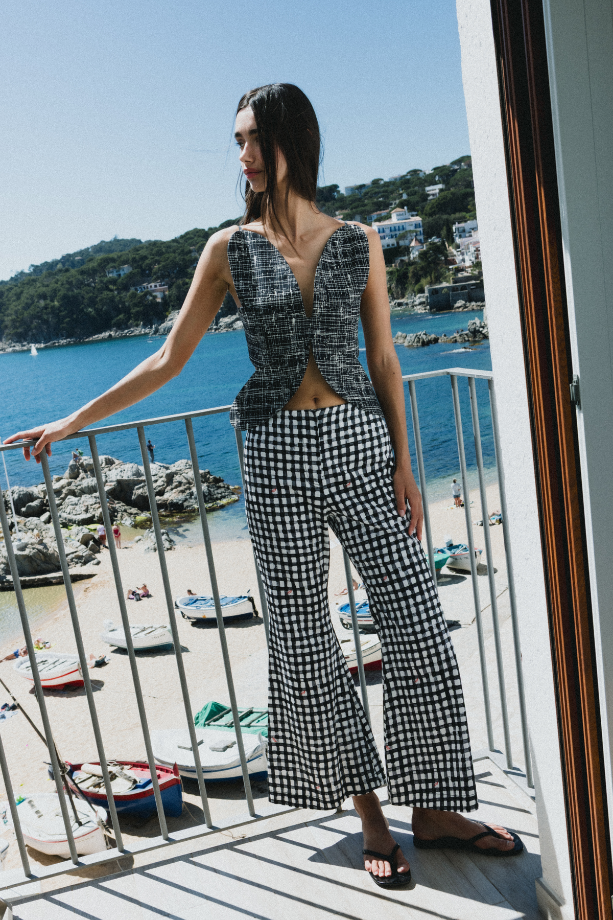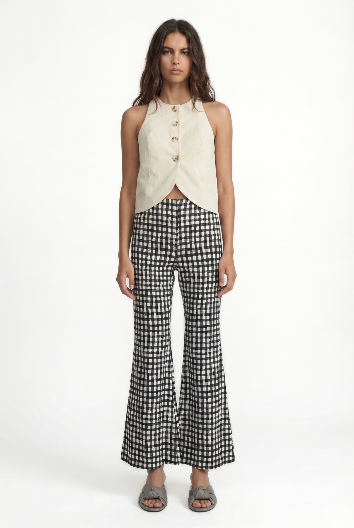 Bilek hizasında biten kesimi, vücuda oturan üst kısmı, gizli ön düğme kapatması ve dizden aşağı doğru genişleyen A kesim şekliyle bu pantolon, her kıyafete neşeli bir zarafet katıyor.