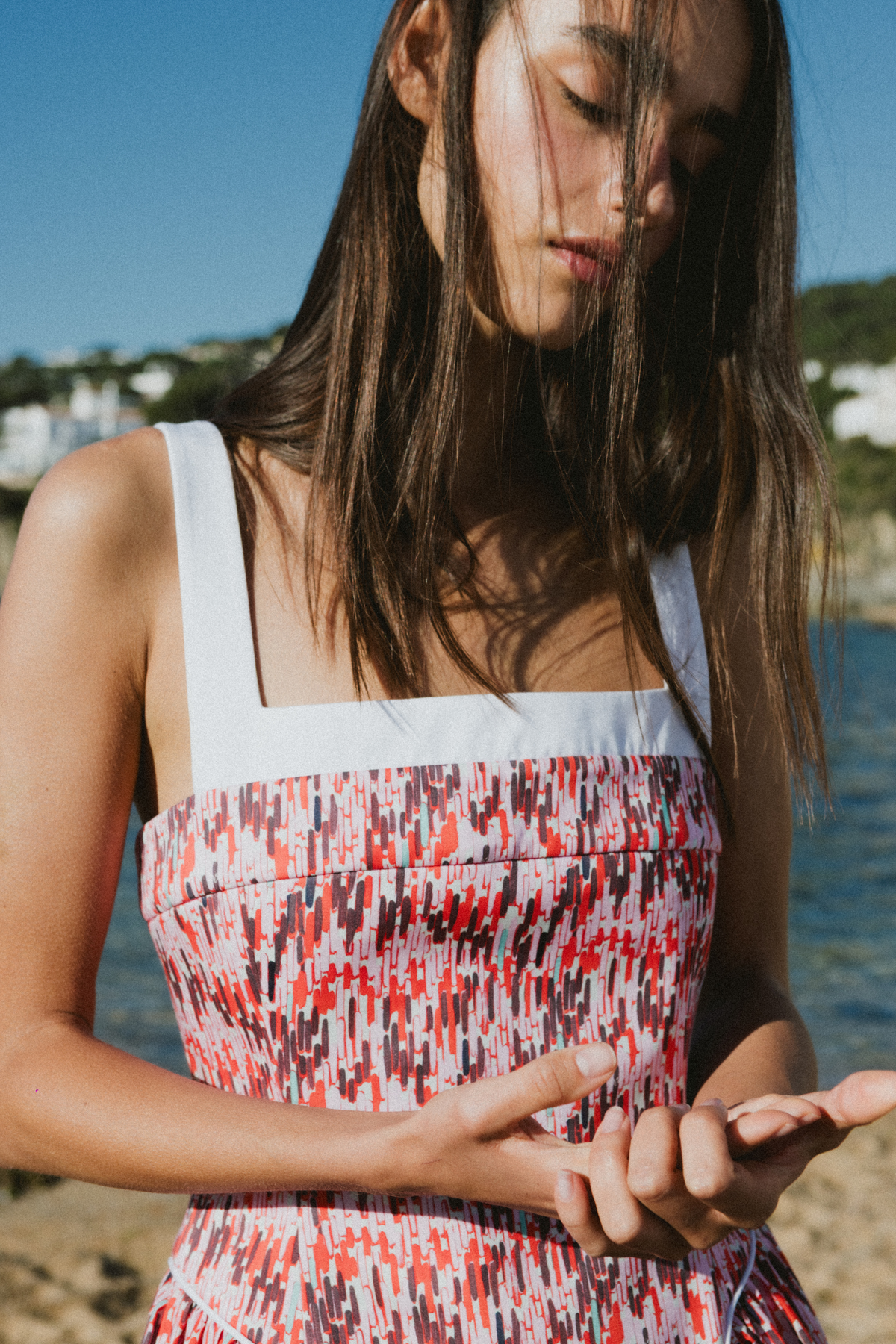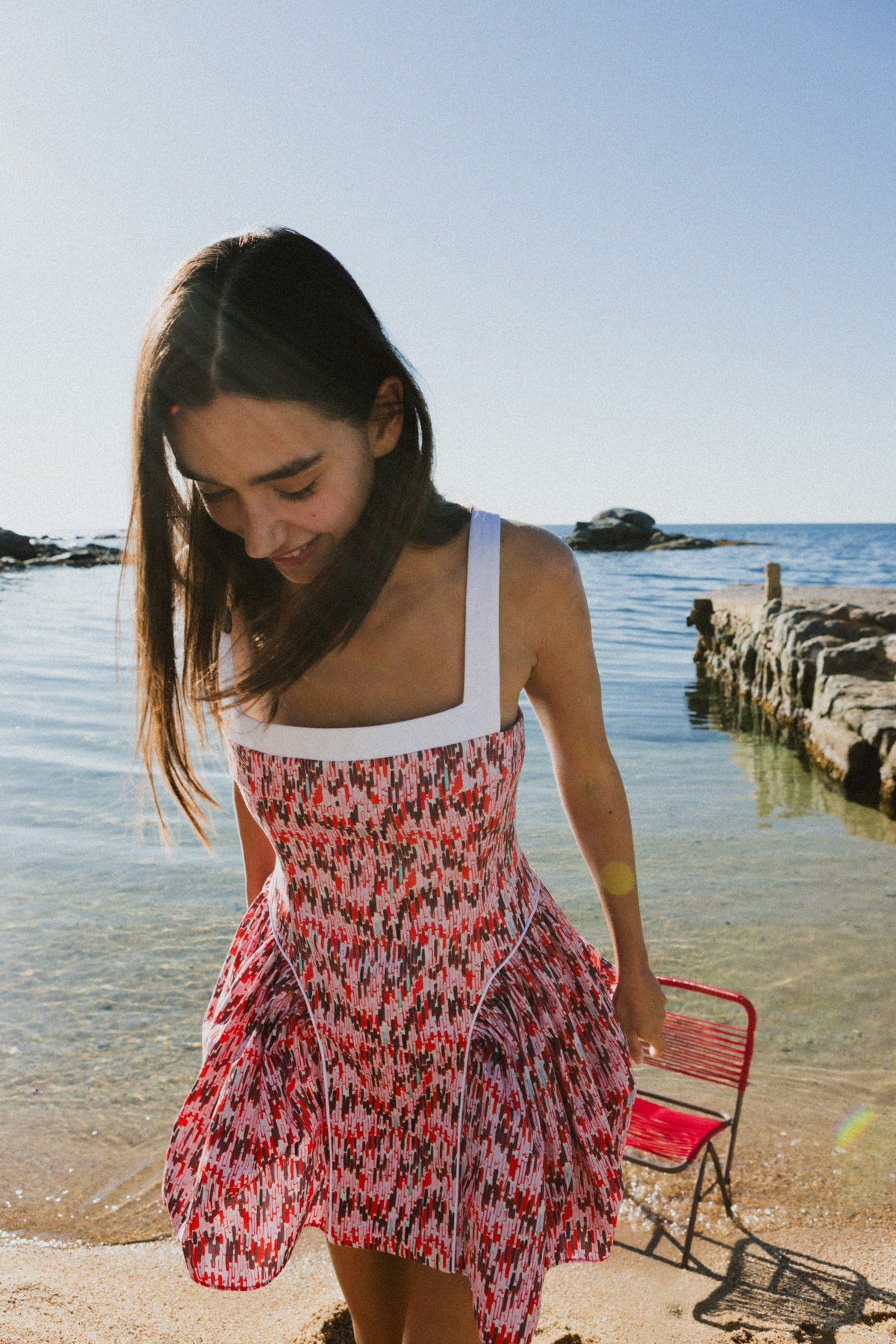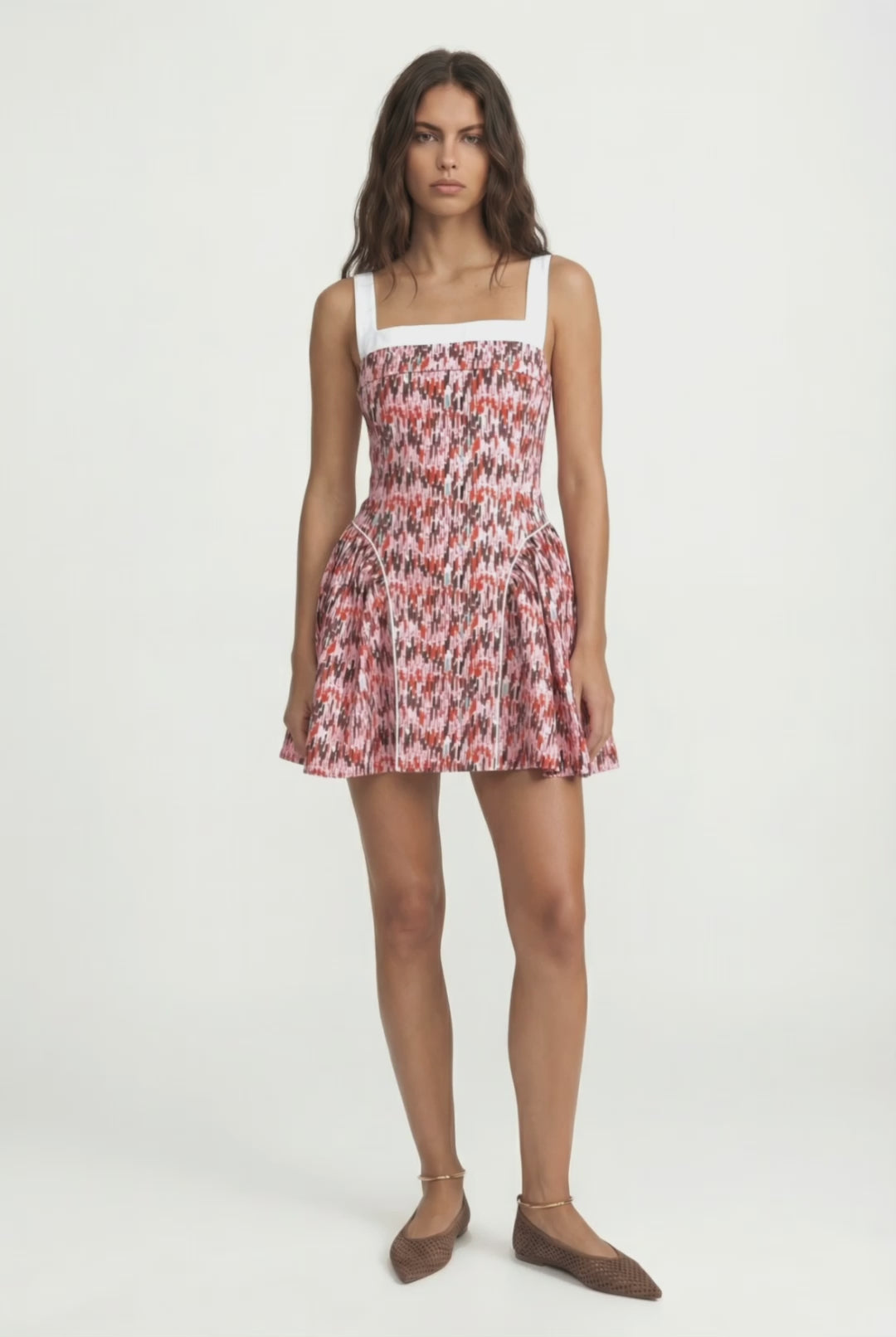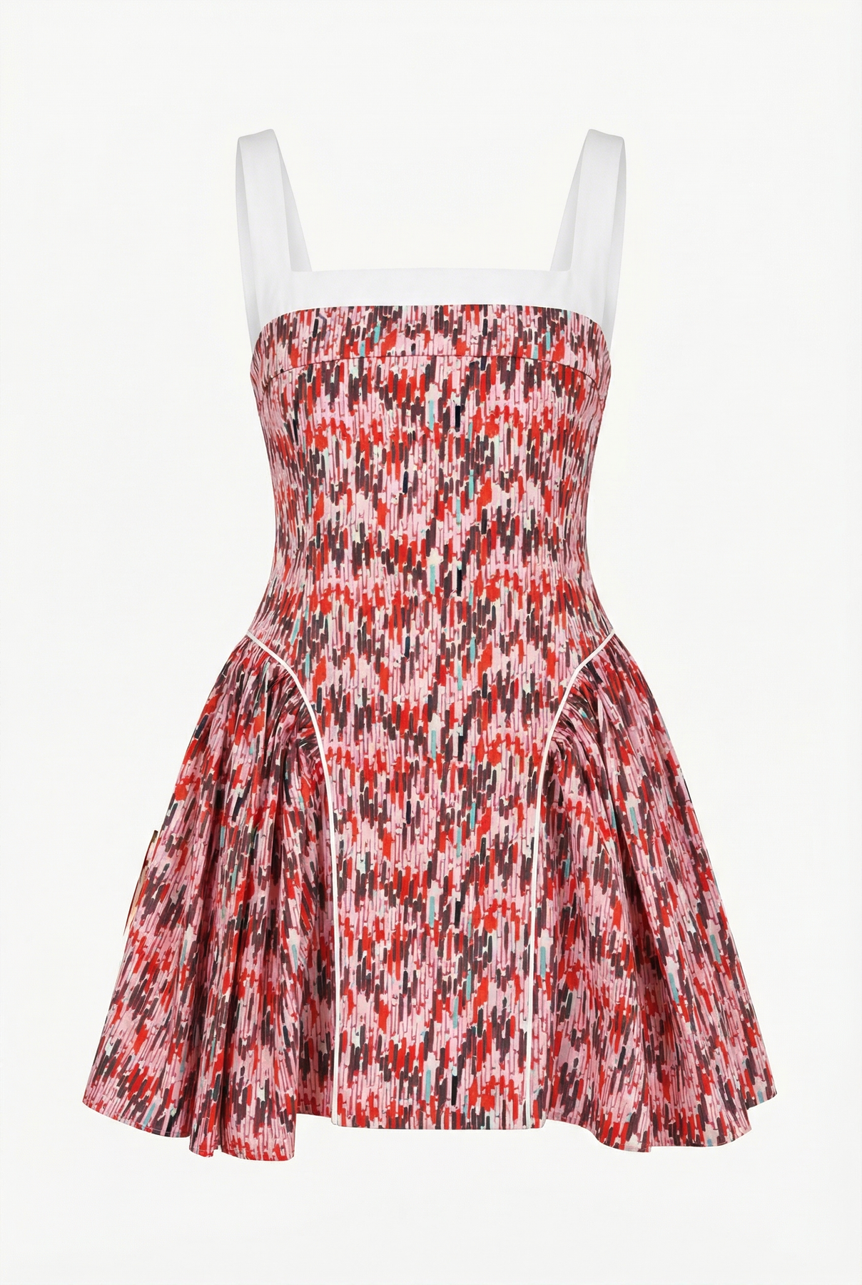 Kırmızı-pembe geometrik kumaştan üretilen Lina mini, kontrast beyaz kare yaka detayı ve vücuda oturup etek kısmında açılan siluetiyle hem zarif hem dikkat çekici bir görünüm sunar. Büstiyer tarzı üst kısmı korselerden ilham alırken, eteğindeki hafif pileler modern ve neşeli bir hava katıyor. Geometrik çizgi deseni elbisenin enerjik ve çağdaş hissini güçlendiriyor.