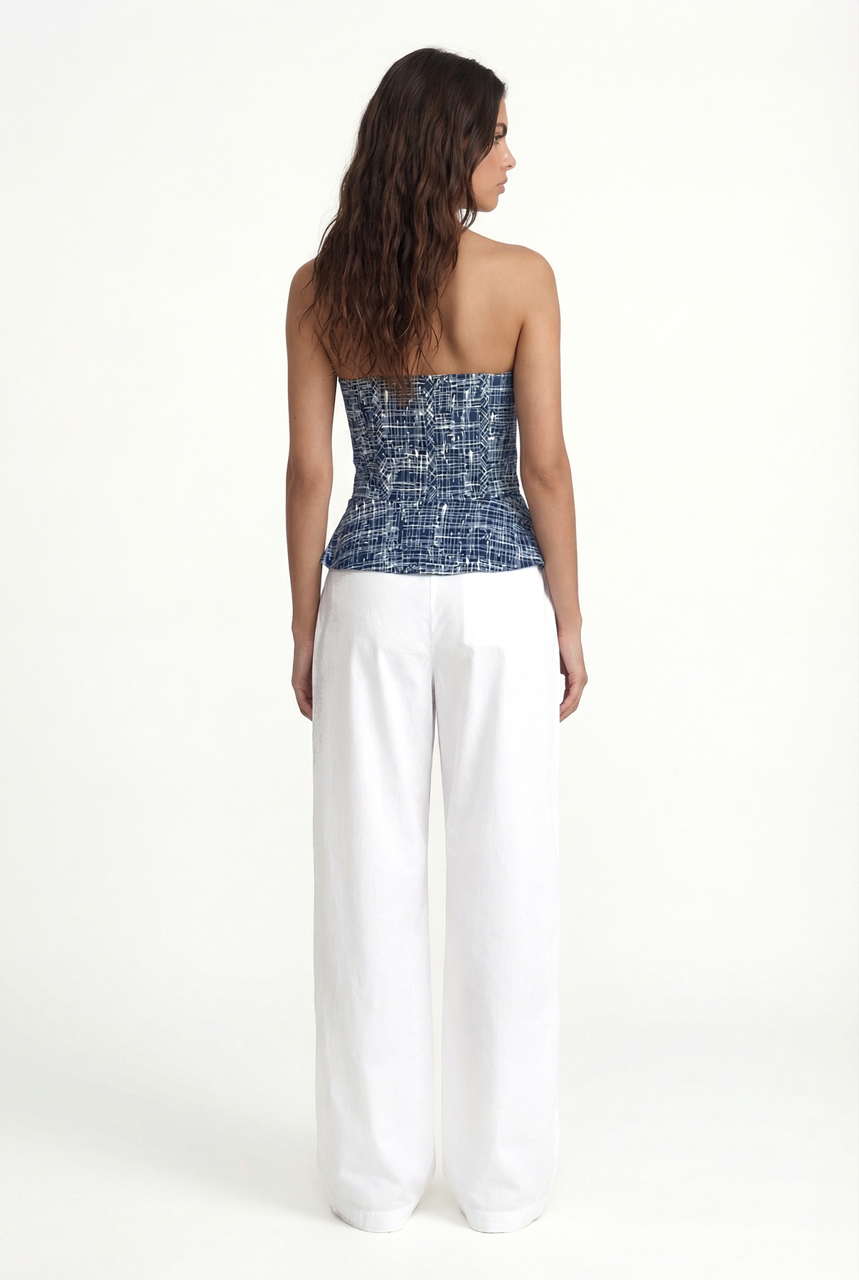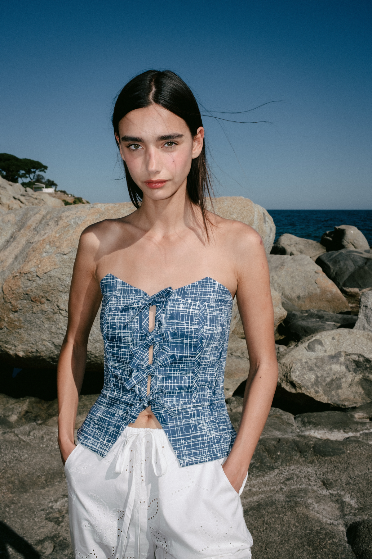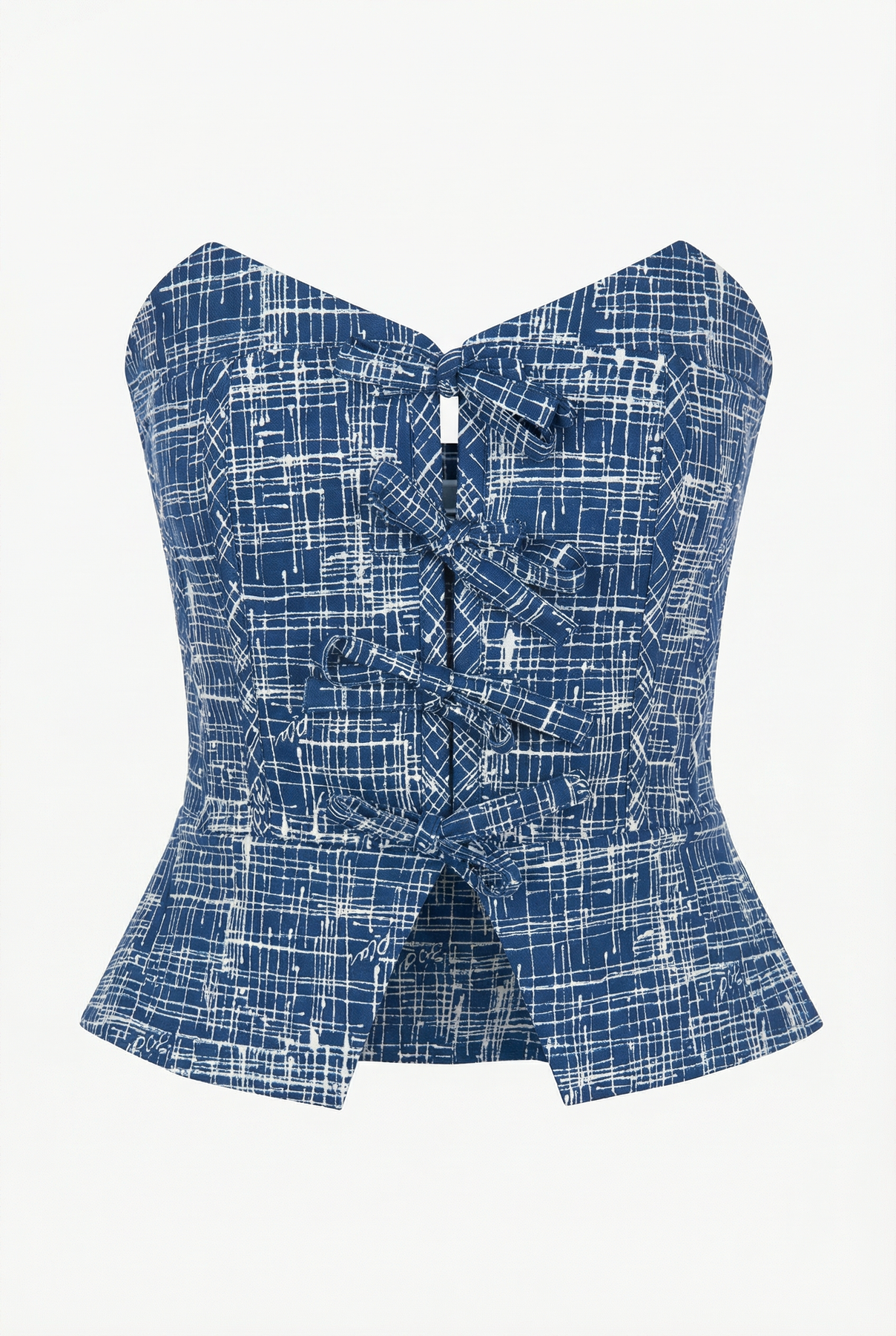 Lacivert tonunda, çapraz çizgi baskılı Bianco büstiyer; yanlardaki grogren balen detaylarıyla yapısal bir siluet sunuyor. Ön kısmındaki korse formunda çapraz bağlama detayı tasarıma güçlü bir karakter katıyor. Yan kısmında gizli fermuar yer alıyor.