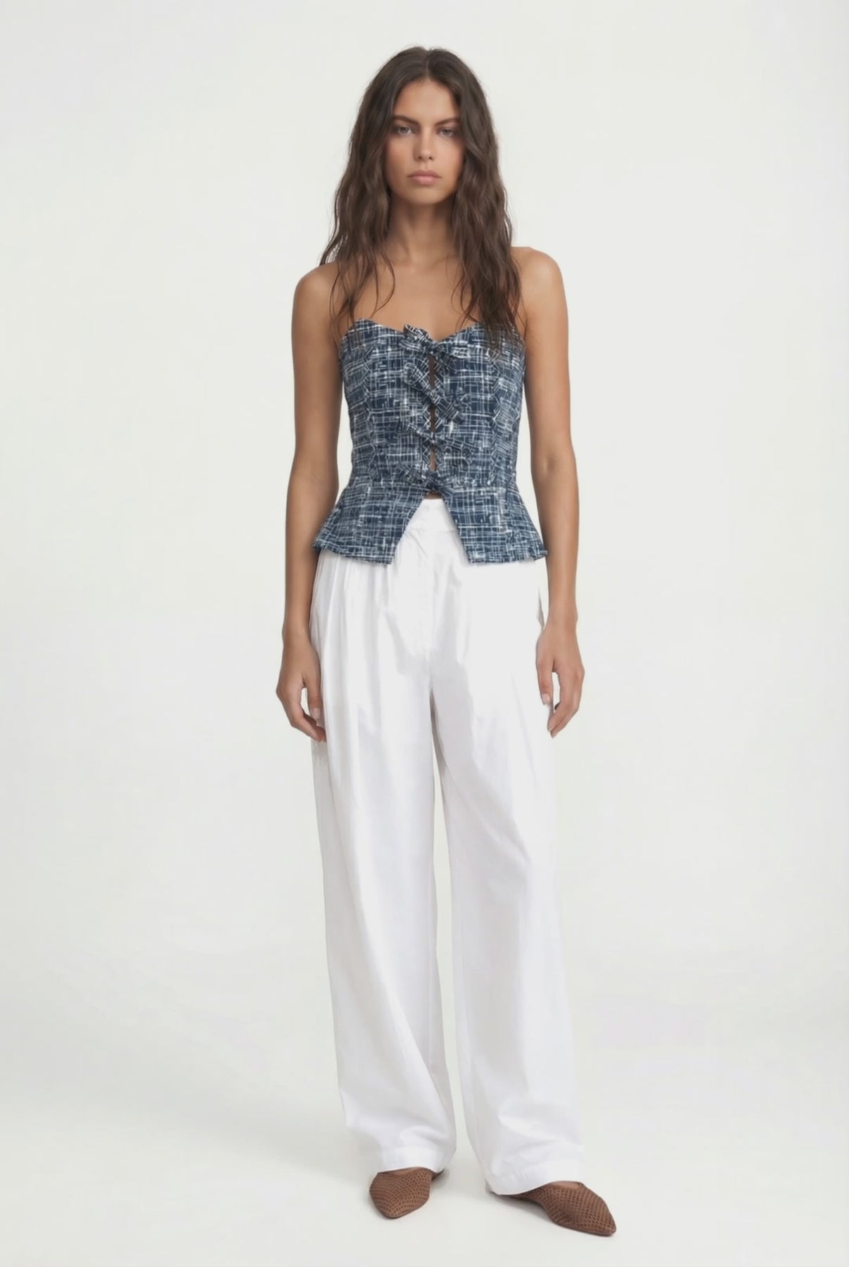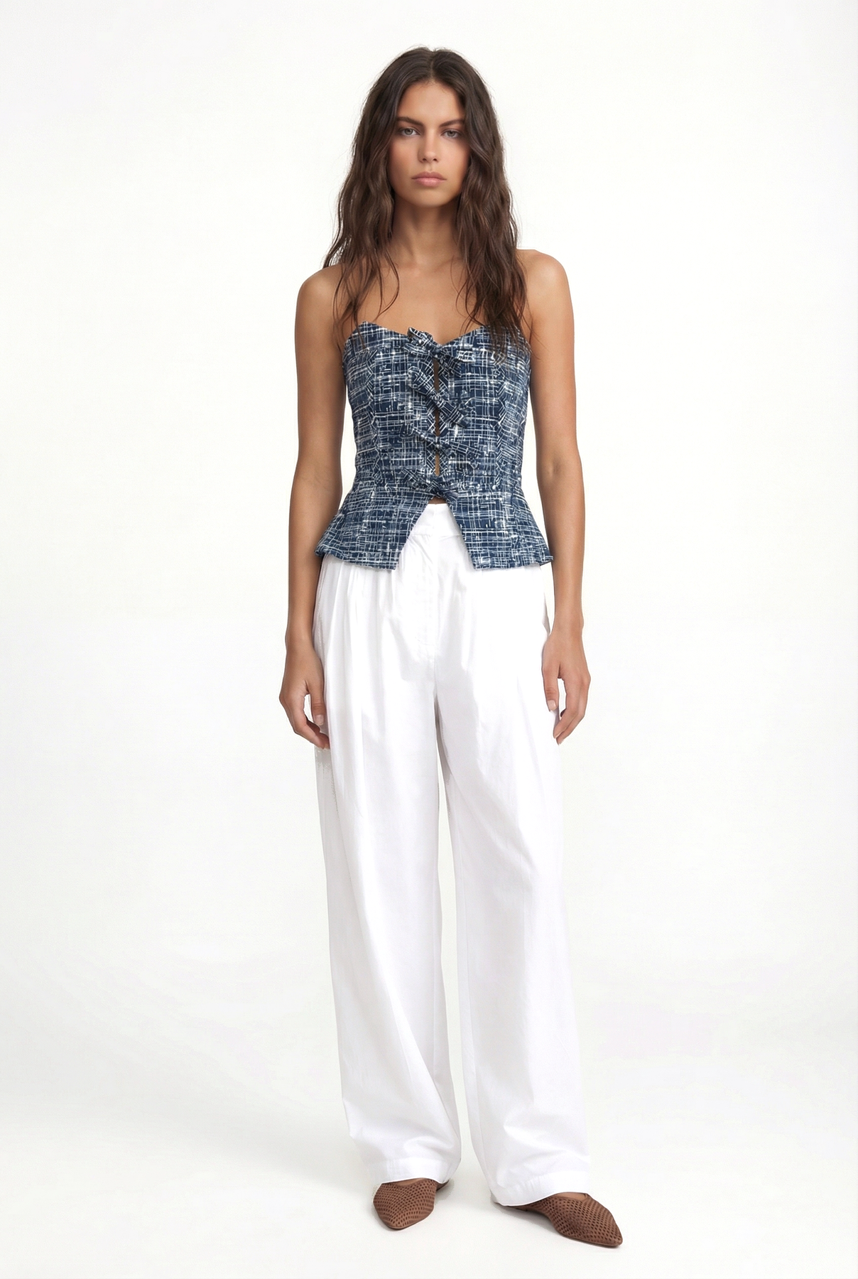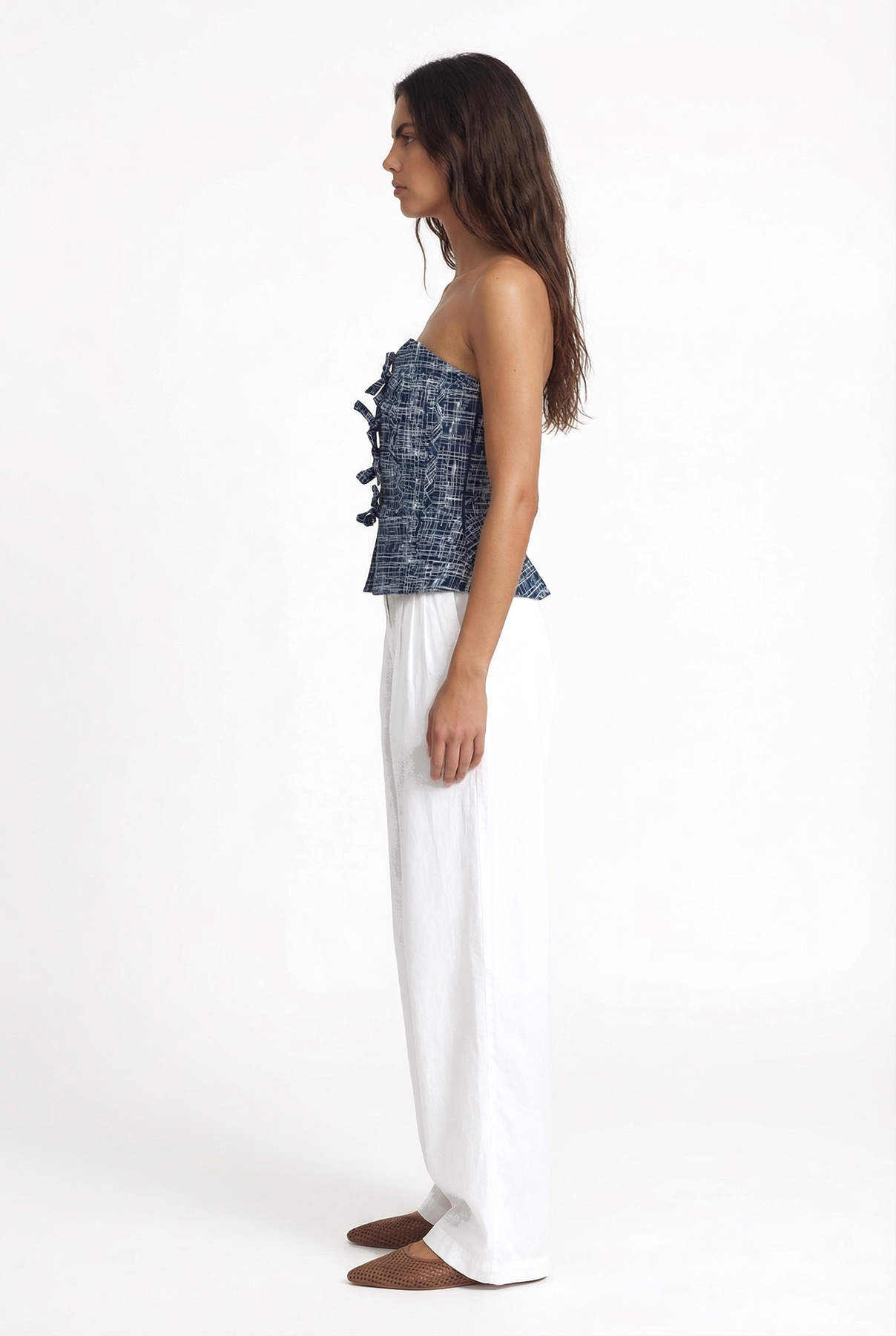 Lacivert tonunda, çapraz çizgi baskılı Bianco büstiyer; yanlardaki grogren balen detaylarıyla yapısal bir siluet sunuyor. Ön kısmındaki korse formunda çapraz bağlama detayı tasarıma güçlü bir karakter katıyor. Yan kısmında gizli fermuar yer alıyor.
