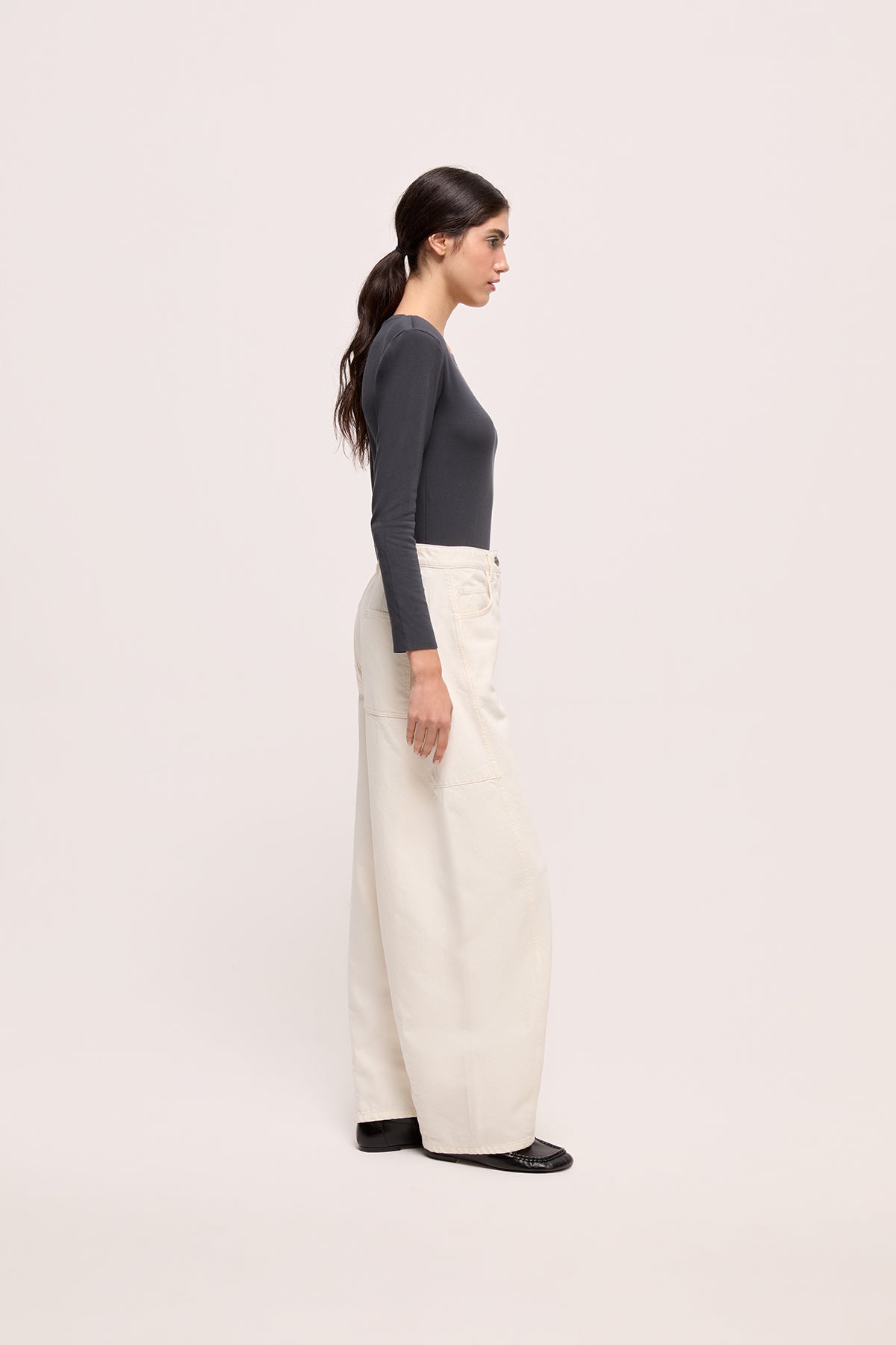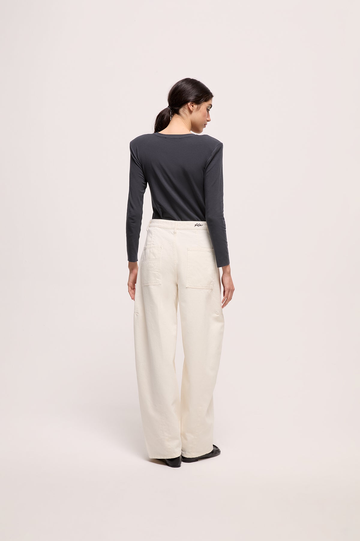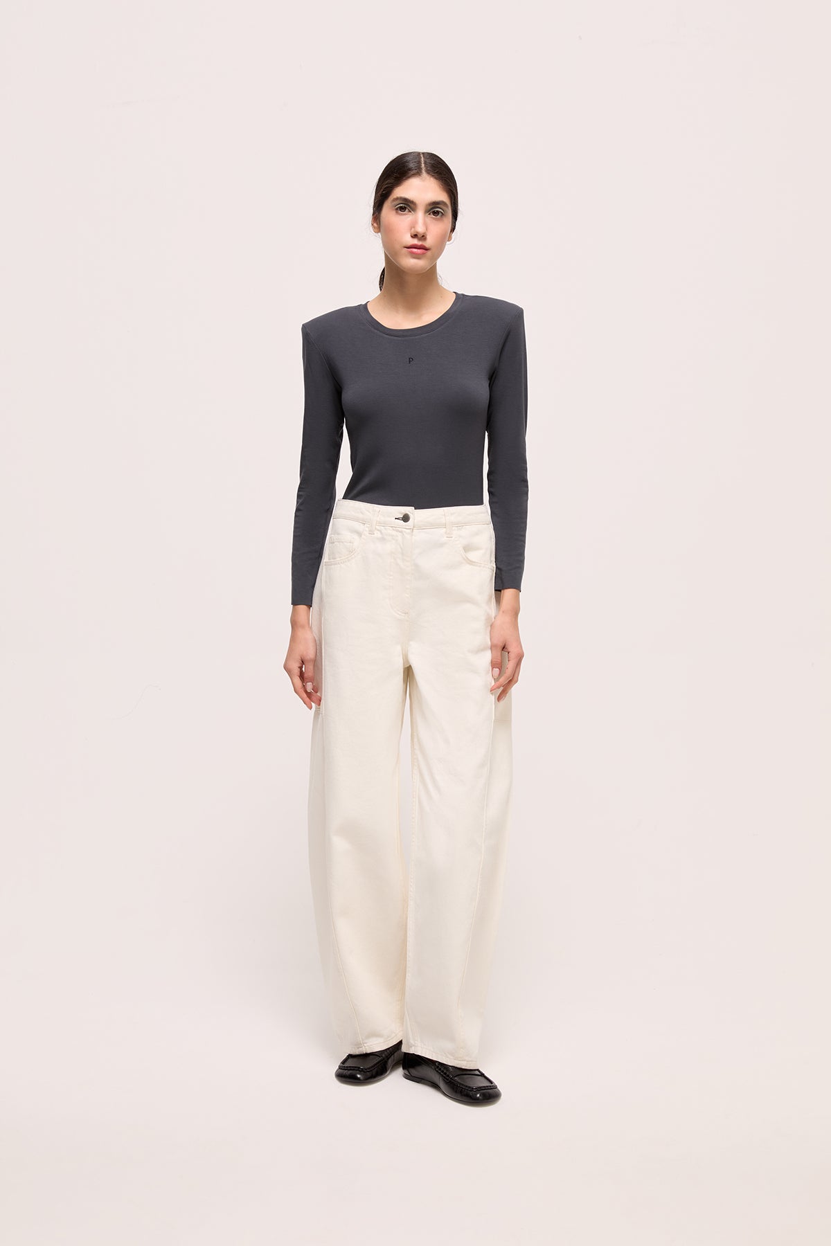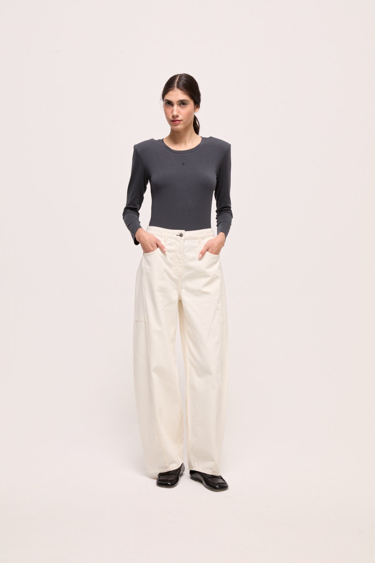 Bu denim pantolon, gün boyu rahatlık sunan balon formuyla modern bir silüet oluşturur. Diz çevresindeki panel dikişleri modele hafif bir yapı kazandırırken, arka kemerdeki Pia ve cepteki P nakışları tasarımı sade ama belirgin detaylarla tamamlar. Günlük stile kolayca uyum sağlayan çok yönlü bir parçadır.